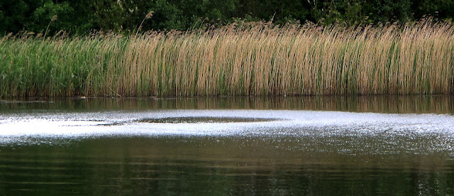 Following up on one of the weekend's leads, I decided to pay the lake, where I'd seen a group of what I hoped might be rudd swimming in the surface layers of the water, a visit. On arrival it was clear that I'd not find them easily because the entire Northern end of the lake was alive with fish moving around, and in the reeds and rushes, busy spawning. I couldn't say for sure which fish were spawning and which fish were eating the same. Some fish were in the throng were very small, some much larger, though I fancied I saw the green flank of a tench amongst them all.